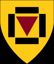Or, a triangle inverted gules between in fess two pallets couped and in pale two bars couped sable.